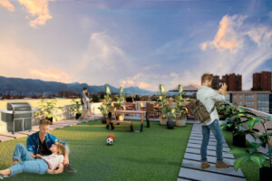 En terraza Torre 2: Terraza con zonas de estar y BBQ, área lúdica y amplios espacios recreacionales.